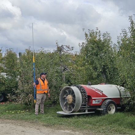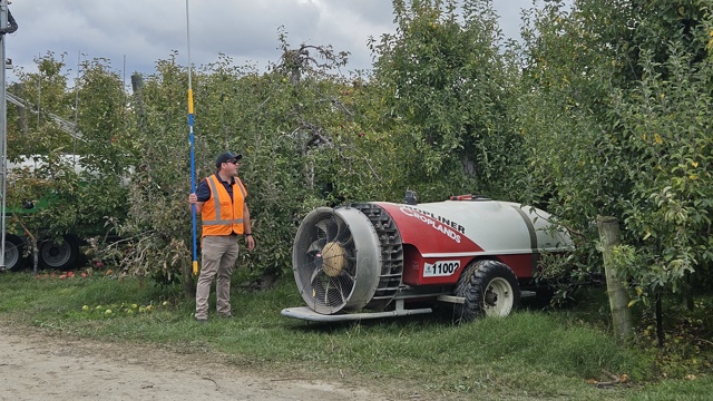 Results showed that air slowed down rapidly after it left the sprayer, so wider row spacing or taller trees required greater air output to guarantee coverage on treetops. Air volume also decreased as tractor travel speed increased, meaning an effective way to get more spray to the top of orchard was to reduce travel speed.